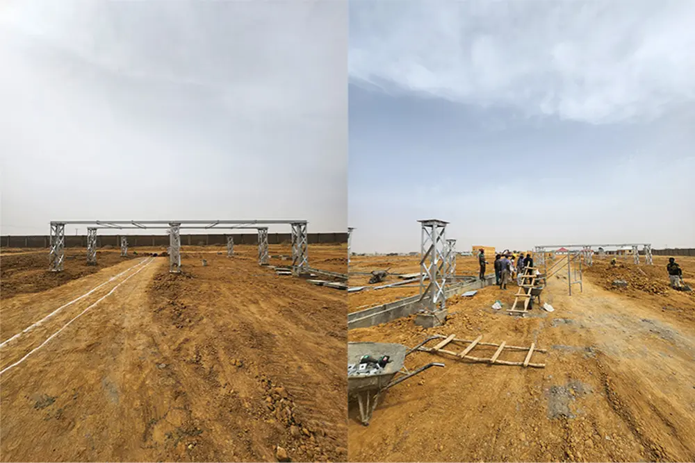 مقامی درجہ حرارت 35.6 ڈگری سیلسیس تک پہنچنے کے باوجود عملہ تیزی سے آگے بڑھ رہا ہے۔ جستی سٹیل کے اجزاء اب زمین پر ہیں اور جگہ پر رکھنے کے لیے تیار ہیں۔ یہ ڈھانچے 330kV سب اسٹیشن کی بھاری مانگ کو سنبھالنے اور مقامی پاور گرڈ کے لیے طویل مدتی استحکام کو یقینی بنانے کے لیے بنائے گئے ہیں۔